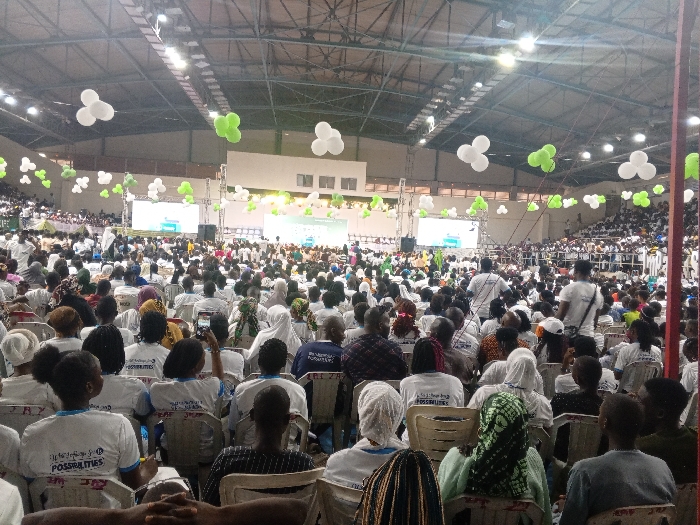 An interior wide shot captures a large-scale gathering within an arena or convention hall in Unknown, Unknown
