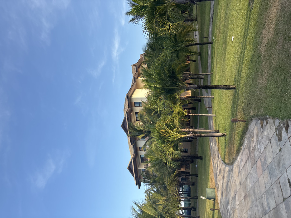 The image displays an outdoor scene in Caucaia, Brazil, under a clear blue sky with sparse, wispy clouds. A multi-story building, likely a hotel or resort, occupies the background, featuring a light cream-colored facade, dark brown tiled roofs with gables, and multiple windows and balconies. The building is largely surrounded and partially obscured by numerous palm trees of varying heights, characterized by slender trunks and vibrant green fronds. A winding pathway constructed from light grey square flagstones extends from the lower left foreground, curving towards the right midground. The area adjacent to the pathway and surrounding the building consists of well-maintained green grass. Several small, dark brown garden lights are strategically placed along the pathway's edge and within the grassy areas. A rectangular green utility box or bin is visible in the left foreground near the pathway. No individuals, animals, or vehicles are present.