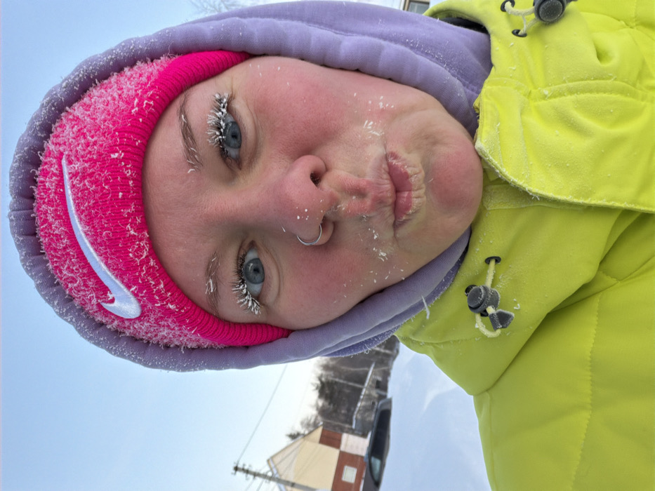 The image displays a close-up, front-facing view of an individual in Chaikovsky, Russia, outdoors on a clear, cold day