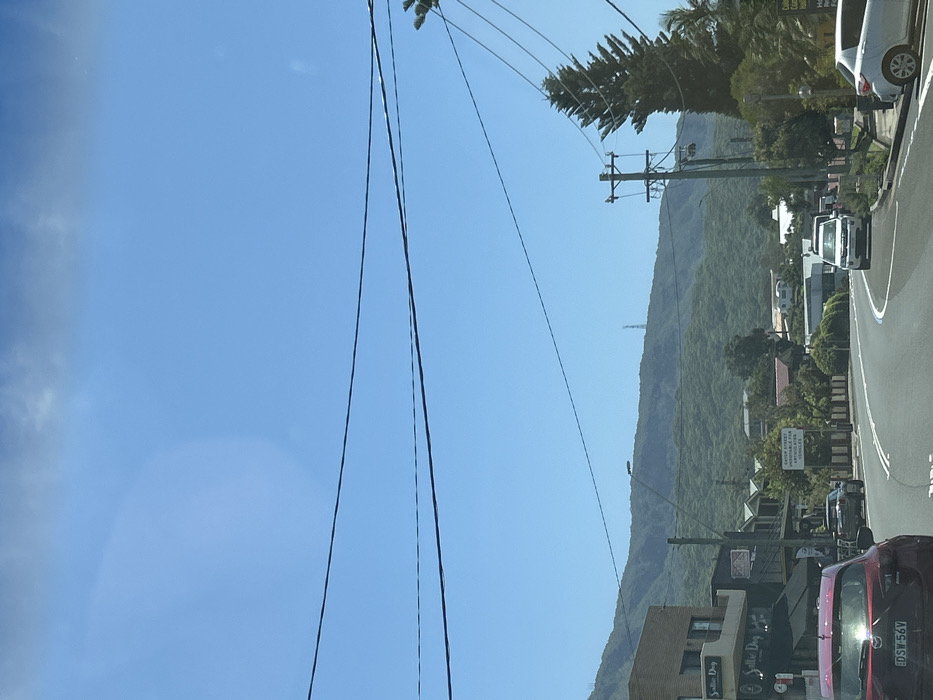 A street scene with overhead power lines dominates the left sky view. The right showcases a tree-covered mountain backdrop. Buildings and road traffic occupy the lower-right portion, with a glimpse of a vehicle license plate visible. Bright daylight illuminates the scene, showcasing a mix of natural and urban elements.
