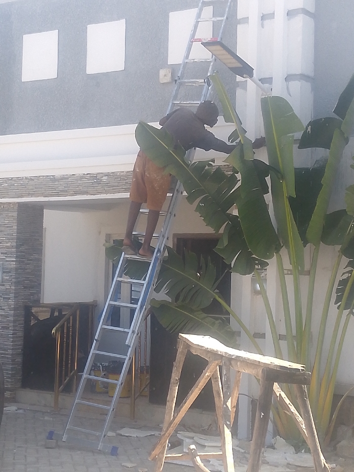 A daytime exterior scene in Kwang, Nigeria, shows a dark-skinned male positioned on a silver-colored aluminum extension ladder against a building