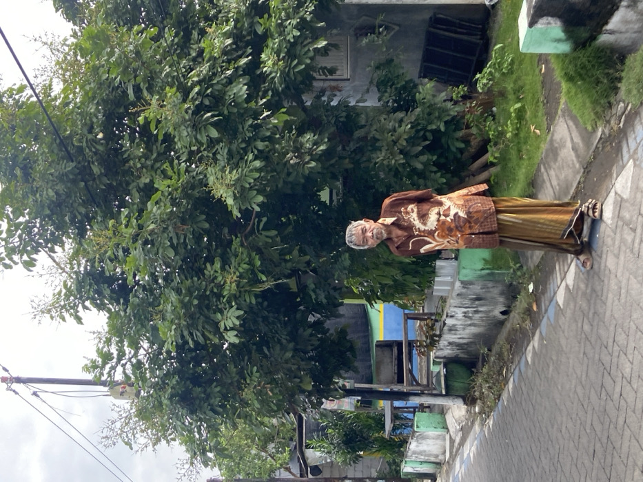 An elderly man stands beside a tree on a paved street. He wears a brown shirt with a dragon design and a gold sarong. The tree's leaves mostly obscure a building behind him, painted with blue and yellow accents. The street is lined with green foliage, and a utility pole is visible on the left, extending into the overcast sky.