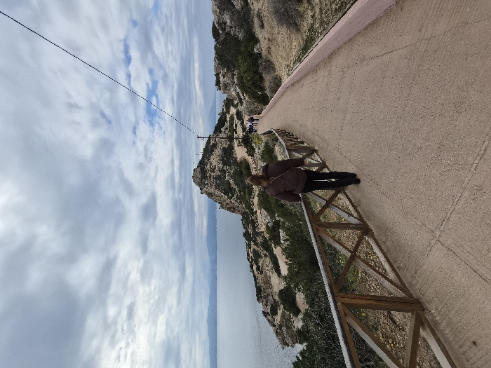 The image displays a paved coastal pathway under an overcast sky in the Municipal Unit of Loutraki - Perachora, Greece. A single individual, viewed from behind, with long light brown hair, wearing a dark brown jacket, black trousers, and carrying a dark shoulder bag, walks along the path. To the left, a wooden railing with horizontal and diagonal members separates the path from a steep, rocky slope covered in sparse green and brown vegetation that descends to a calm, dark blue-grey body of water. A prominent rocky promontory, topped with indistinct structures, extends into the water in the mid-ground, with hazy mountains visible on the distant horizon. Further along the pathway, near the promontory, a small group of approximately three to five individuals is also walking away from the camera. The light brown, textured path is bordered on its right side in the mid-distance by a low, light pink concrete barrier. A dark, thin utility line stretches diagonally from the upper right of the frame towards the center-left. The sky is dominated by layers of grey and white clouds.