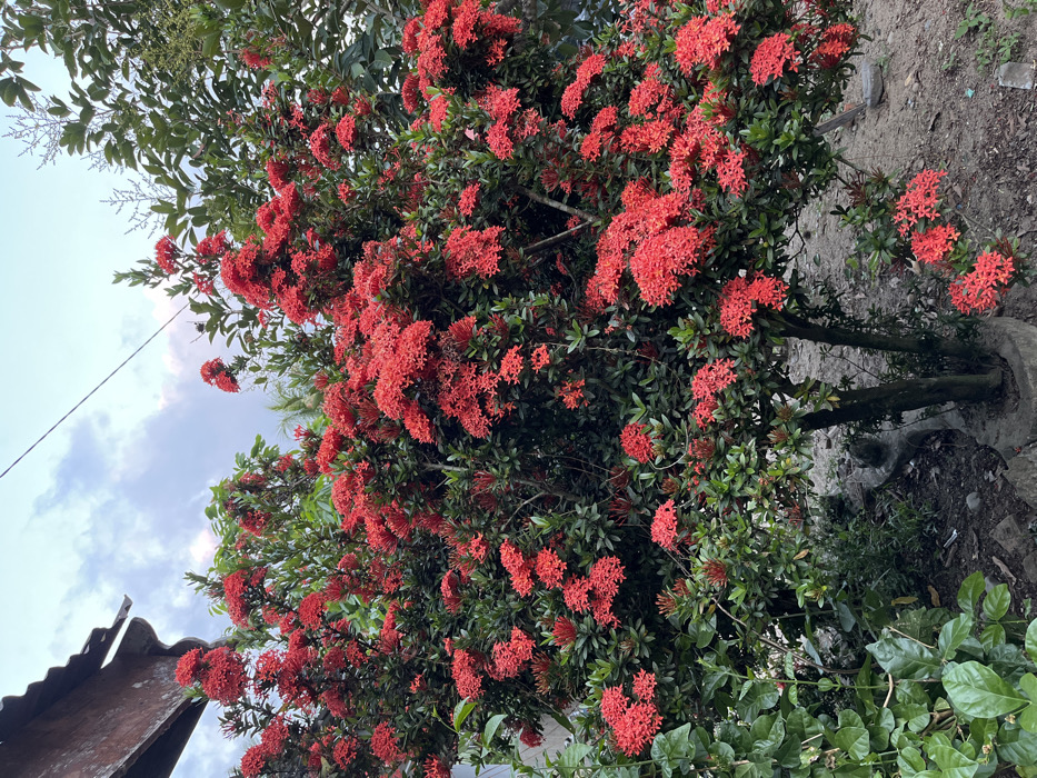 - "The image depicts a vibrant, large Ixora coccinea bush, densely covered with numerous clusters of small, bright red flowers and dark green foliage" by FM-ptDWd2, licensed under CC BY 4.0