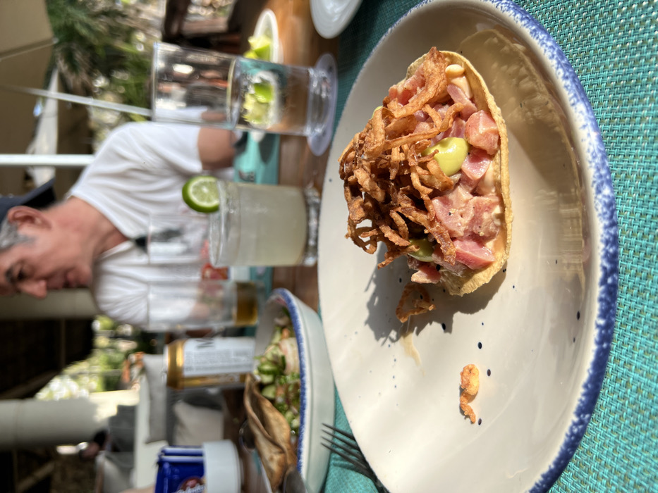A close-up shot shows a tuna tostada topped with fried onions on a white plate with a blue rim. To the left, a man in a white shirt sits at the table, partially visible. A glass of water with lime and a glass of a yellow drink with a lime slice are on the table, along with a beer can. A second tostada is visible in a shallow bowl. A fork is also present on the table.