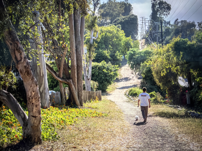 The image depicts an outdoor scene in Manhattan Beach, United States of America, showing a person walking a dog on an unpaved dirt path