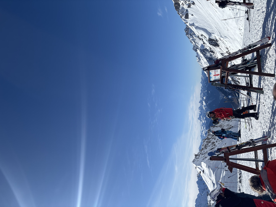 The image depicts a snow-covered alpine environment on a clear, sunny day, located within the general vicinity of Klösterle, Austria. The sky is deep blue, with bright sun glare visible in the upper left quadrant. The foreground features a flat, snow-covered area where several individuals in ski attire are present. Two wooden ski racks, holding multiple pairs of skis and poles, stand in the center and right foreground. One rack displays a red and white sign with "WINTERSPORT" partially visible. In the foreground, a person in a black jacket and red pants, wearing a white helmet, stands with their back to the camera, beside a ski rack. Another person, largely obscured, in a red jacket is seated or leaning at the bottom center. In the midground, a person in a red jacket and dark helmet stands holding ski poles near a rack, facing slightly right. To their left, another individual in a light blue jacket and helmet stands with skis and poles. Additional figures in ski gear are partially visible further back. The background consists of extensive snow-covered mountain ranges under a clear sky. A prominent, jagged, snow-capped peak is visible in the mid-left, with a ski lift structure or station at its summit and an associated lift line extending down. A valley containing a distant settlement is discernible in the mid-right. The slopes on the right side of the frame feature steep, rocky terrain covered in snow, with visible avalanche control fencing. Blue flags or markers are scattered across the snow in the midground.