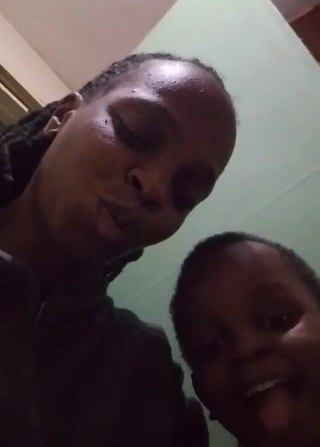 A woman and a young boy are in close proximity in a room. The woman is holding the camera, creating a selfie-style shot. Her hair is styled in braids and she makes playful facial expressions. The boy is next to her, smiling. The background consists of a wall. The lighting in the room appears to be dim.