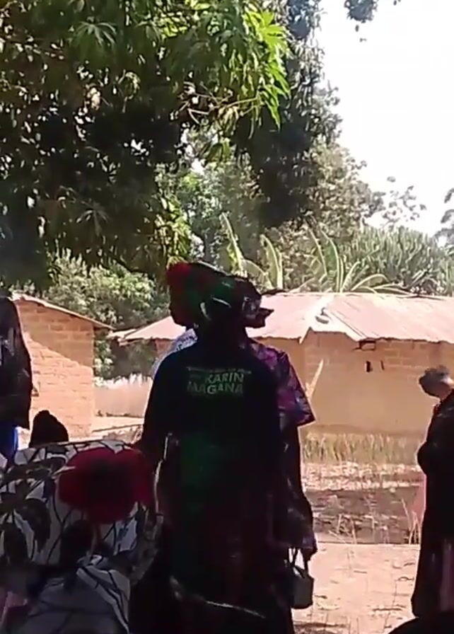 group of people gathered in what appears to be a rural setting, possibly a village. There are trees, and simple buildings with brick walls and metal roofs are visible in the background. Several adults are standing around, some wearing traditional clothing and headwraps. One person has a t-shirt on with writing that appears to say "KAVIN MAGNA" on the back. A young girl in a pink dress is walking nearby. The overall scene suggests a social gathering, perhaps a celebration or community event. The camera seems to be held by someone within the group, capturing a partial view of the surroundings and the people present.