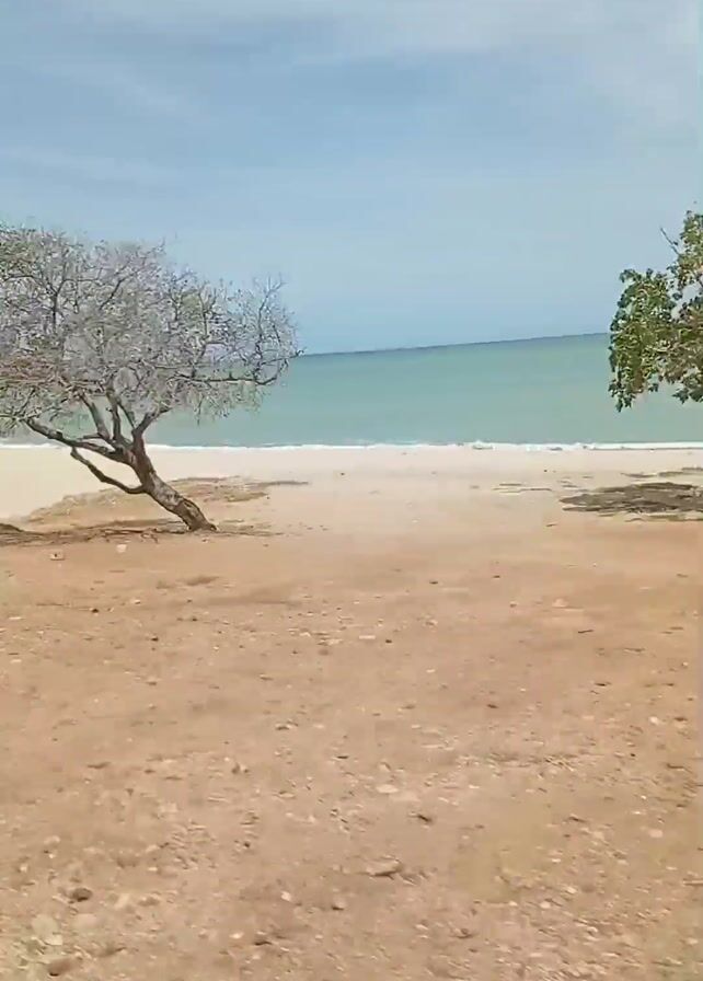The video depicts a beach scene captured from a moving vehicle. The foreground is characterized by dry, brownish grass and sandy ground. Scattered small trees with green foliage are interspersed throughout the scene. The focus shifts between individual trees and the broader landscape. In the background, a sandy beach meets turquoise-colored water under a light blue sky. The camera's movement suggests it is mounted on a vehicle traveling along a road or path parallel to the beach. Brief glimpses of the vehicle, such as a rearview mirror, are visible at times.