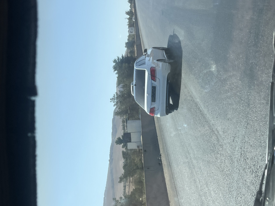 The image depicts a daytime scene on an asphalt highway in Al-Qutaifa, Syria, viewed from within a vehicle through its windshield. A white Mercedes-Benz E300 sedan is prominently featured in the midground, traveling away from the camera in the right lane. The vehicle's rear license plate area is empty, lacking any visible plate. A concrete barrier runs along the left side of the highway, beyond which sparse vegetation and a rudimentary structure composed of white and dark panels are visible. The background reveals arid, undulating hills under a clear, light blue sky. A white road sign with a dark, indistinct symbol is present on the right side of the road in the distance. No individuals are discernible in the scene.