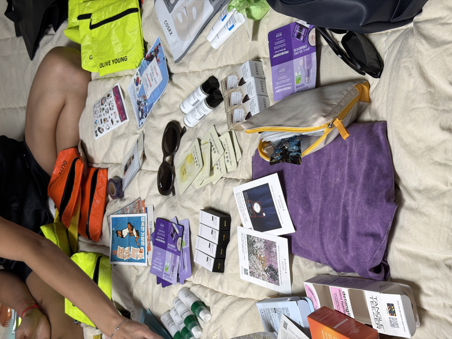 - "An indoor scene displays a collection of cosmetic and retail items spread across a light beige quilted surface, likely a bed or floor" by FM-PcEqo1, licensed under CC BY 4.0