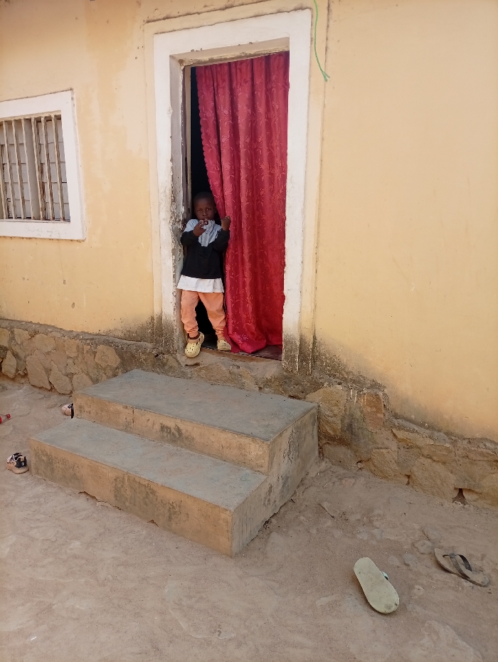 A young child stands within an open doorway of a light yellow building in Barikin Gidar Kanat, Nigeria