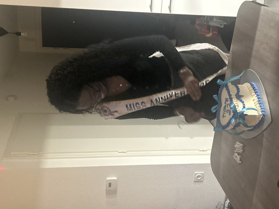 A woman wears a "Miss Anniversaire" sash and glasses. She has dark curly hair and is wearing a black outfit. A cake that reads "Tiffany 33" sits on a table. The cake is decorated with blue icing and ribbon. The background includes a white wall with an outlet and light switch. A door and cabinets can also be seen in the background.