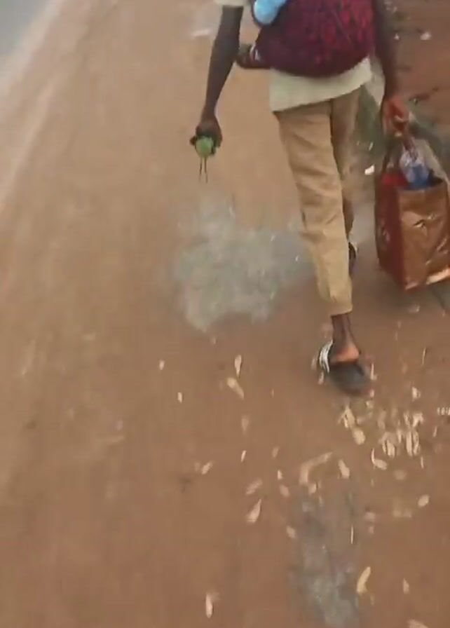 A young person is carrying a small child on their back in a carrier while walking along a dirt path next to a road