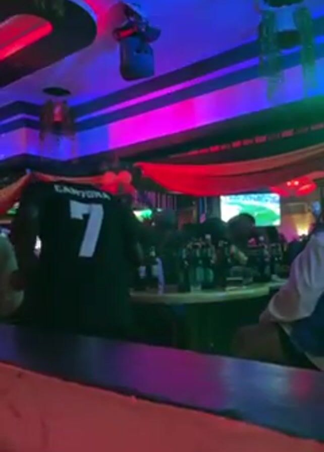crowded bar. A person wearing a black jersey with the name "Cantona" and the number "7" on the back is standing at the bar. A TV screen is visible in the background, displaying a soccer game. Several bottles are lined up on the bar, and patrons are seated around a table. The bar is decorated with colorful lights, including red, blue, and green. There is also some fabric draped across the ceiling.