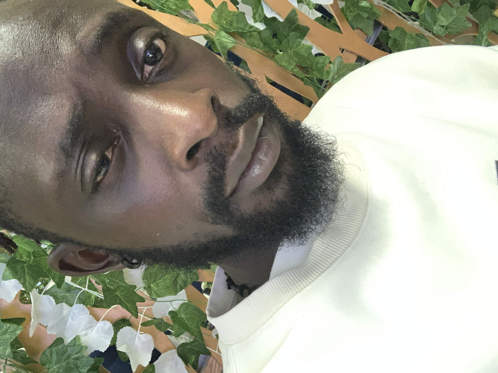 A close-up, angled shot depicts a dark-skinned man with a beard wearing a white sweater. The background includes faux greenery with leaves and a lattice-like structure. Due to the lack of identifiable landmarks or signs, confirming the location within Lekki, Nigeria, is impossible based on the visual information provided.