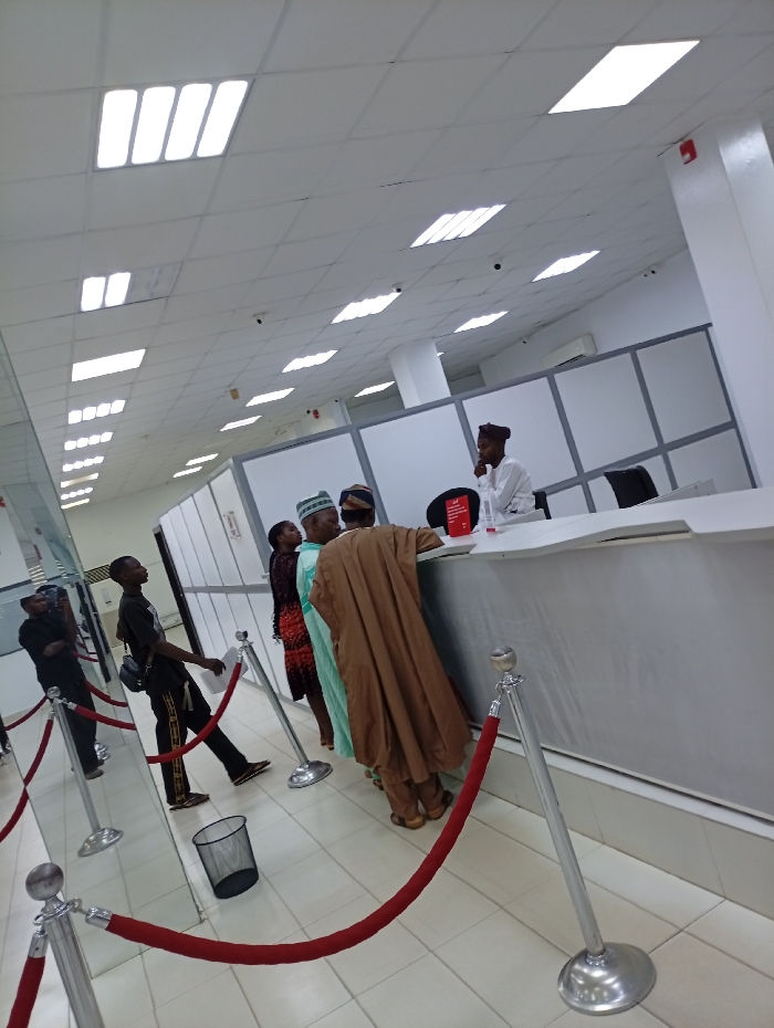 The image displays the interior of a bank in Zaria, Nigeria, characterized by a brightly lit, modern commercial environment