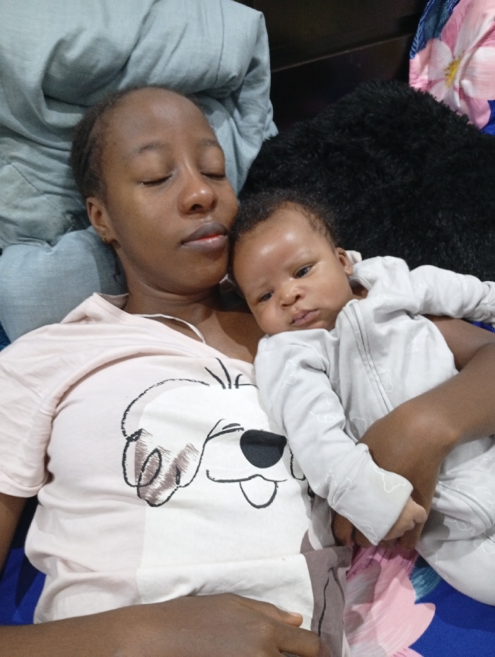 A woman with closed eyes lies on a bed, her arm around a baby wearing a light-colored onesie. The woman's skin is dark and she wears a pink shirt with a cartoon dog face printed on it. The baby also has dark skin and looks alert. There are pillows and blankets in the background, including a floral-patterned one. The scene suggests a quiet, intimate moment between mother and child.