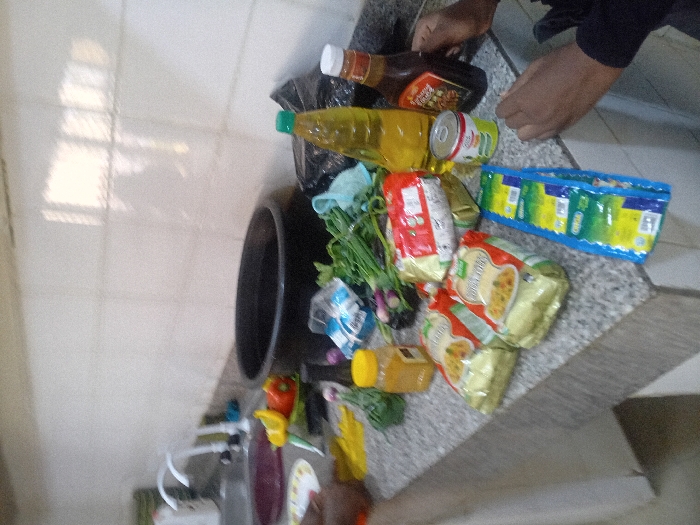 This image depicts a kitchen countertop organized for food preparation. The background consists of light-colored tiled walls, and the countertop itself is speckled gray. On the left, a stainless steel sink with two faucets is visible. Arranged on the countertop are various food items and containers: a large black pot, sliced red and yellow bell peppers, spring onions, and other green leafy vegetables. Further right, a clear jar with a yellow lid contains yellow powdered spice, next to a clear bottle of cooking oil with a green cap and a brown bottle of dark liquid condiment. A small can, marked with the "Kano" brand, is also present. Two large gold-foil pouches, labeled "Indomie Relish Meals," are centrally placed alongside one smaller gold-foil pouch of a similar product and a blue-and-green strip of individual seasoning sachets. Two sets of brown-skinned hands are visible: one on the left near the sink, and another on the right, positioned near the dark condiment bottle, indicating active engagement in food preparation. The environment is consistent with a domestic kitchen in Jos, Nigeria; however, a precise location within the city cannot be ascertained from the visual evidence.