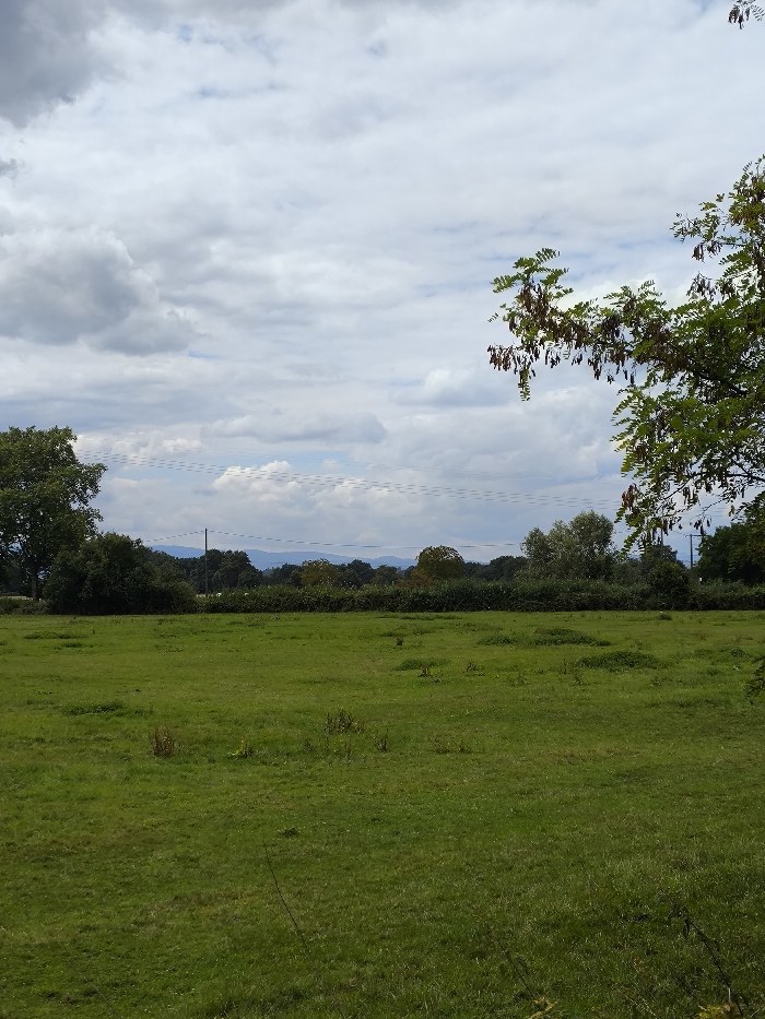 The image depicts an open, rural landscape in Wolfisheim, France, under a partially cloudy sky. The foreground is dominated by an expansive green grass field, showing varying shades and textures of vegetation, with some small clusters of taller growth scattered throughout. No people are present. In the midground, a dense line of various green trees and bushes forms a natural barrier across the horizon, beyond which distant, hazy blue-grey hills or mountains are visible. A dark, slender utility pole stands vertically on the left side of the midground, and multiple thin, horizontal utility lines, appearing somewhat dashed, traverse the upper midground across the sky. The sky occupies the upper portion of the frame, filled with a mix of white and grey cumulus clouds, with patches of lighter blue visible between them. On the far right, a branch from a tree with green leaves and numerous dark brown seed pods extends into the frame. On the far left, a portion of another large green tree is visible. No discernible actions or interactions are occurring. The environment is natural and undeveloped.
