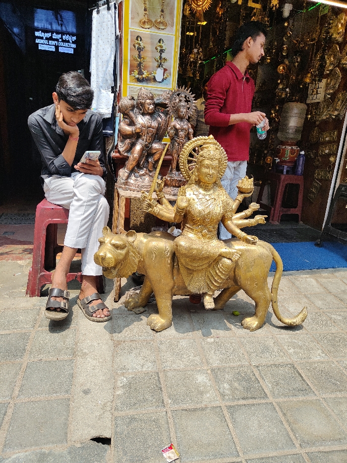 The image captures a daylight street scene in Bengaluru, India, outside a shop selling religious metal artifacts
