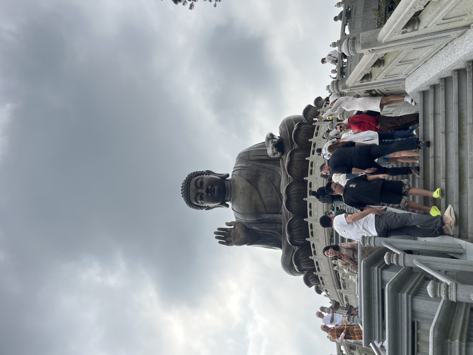 A large bronze Buddha statue dominates the view under a cloudy sky