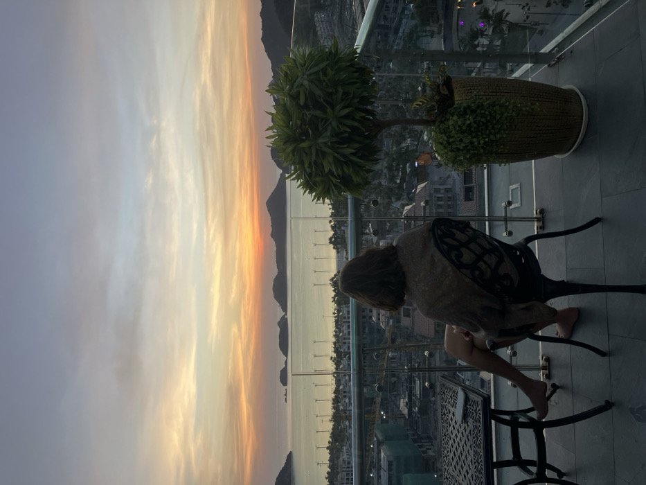 An elevated outdoor balcony provides a panoramic view of a coastal city and bay during sunset. One individual, an adult female with short, dark hair, is seated on a dark metal chair, observed from the back. She wears a light-colored, patterned garment and is barefoot. Her gaze is directed towards the horizon. To her left, a dark square metal table, featuring an intricate lattice pattern, holds a white rectangular object, consistent with a mobile phone. To her right stands a large potted plant, with a dark cylindrical pot and a dense, spherical crown of dark green foliage, along with cascading greenery. The balcony is enclosed by a transparent glass railing with dark metallic supports. Below the balcony, an urban environment features modern buildings, some appearing to be under construction with visible cranes, and illuminated streetlights. Palm trees line roadways within the city. The mid-ground is dominated by an expansive body of water, characterized by numerous karst islands and several visible offshore wind turbines. The sky exhibits a sunset palette of orange, yellow, and purple hues with scattered clouds. This scene is consistent with a coastal development in Hải Phòng, Vietnam, likely overlooking the Cát Bà Archipelago or similar karst formations within the broader Hạ Long Bay area, featuring modern urban infrastructure and ongoing development.