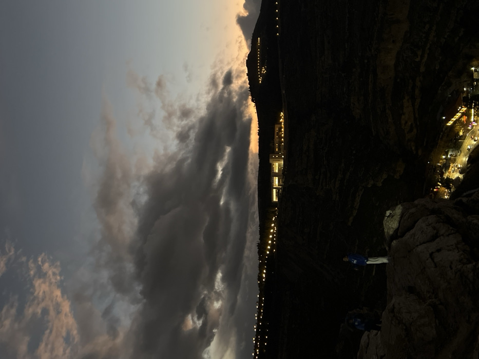 The image depicts a nighttime panoramic view of Dummar Municipality, Syria, at dusk. The sky is largely covered by dense, dark gray clouds, with a band of lighter blue-gray visible in the upper sky and a strip of warm orange and pink light from the setting sun along the eastern horizon. In the immediate foreground, to the lower left, a large, rugged, brownish-gray rocky outcrop is present. Two individuals are standing on this outcrop. The person on the left is partially obscured, wearing a dark top. The second person, positioned more centrally, faces right, clad in a dark blue long-sleeved top and light-colored pants. The midground consists of a steep, dark valley or ravine, largely obscured by shadow but revealing some textural details of rock and earth. In the distant background, several illuminated features are visible across dark hills. A horizontal line of uniformly spaced, small yellow lights stretches across a hill on the left. Centrally, a prominent, multi-story building complex with numerous lit windows emits warm yellow light, positioned on a distant plateau. To the right of this complex, another hill ascends, marked by a curved line of smaller lights. Below the valley in the lower right, a section of an urban area is visible, characterized by multiple points of artificial light from streetlights and vehicle headlights on a road, as well as illuminated windows of buildings.