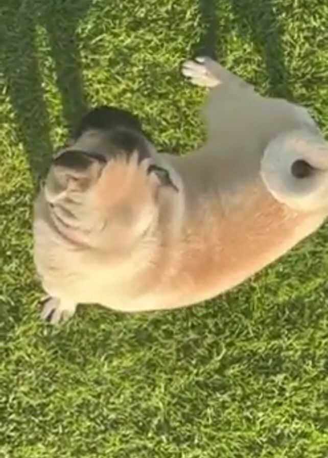 Here's a concise description of the video: A pug lies on its back in a patch of green grass, paws in the air