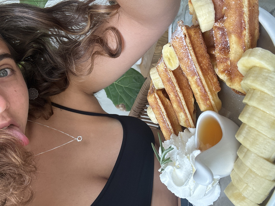 In Khlong Sok, Thailand, a close-up, angled shot captures the upper torso and partial face of a female subject, positioned above a meal. The subject, with wavy brown hair, wears a black spaghetti strap top and a silver necklace with a small, intricate pendant. Her right eye, with a blue-green iris, is visible, and her tongue is partially extended from her mouth. A small, possibly filigree, earring is present in her right ear. The foreground is dominated by a plate of food. Multiple golden-brown waffles, lightly dusted with powdered sugar, are arranged on the plate, interspersed with several slices of fresh banana. To the left of the waffles, a dollop of white whipped cream is garnished with a sprig of fresh rosemary. Adjacent to the whipped cream is a small, white, swan-shaped ceramic pitcher containing a light amber liquid, likely honey or syrup. Additional banana slices are neatly arranged along the bottom edge of the plate. The background features elements of a wicker or rattan chair and large green plant foliage.