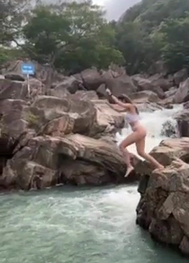 woman jumping off a large rock into a river. The woman has long, brown hair and is wearing a light-colored bikini. She stands on the rock's edge with her arms outstretched for balance before jumping. The river is a clear, light green color and has small rapids flowing around the rocks. The banks of the river are covered in lush green trees and rocky outcrops. A sign is visible on the rocks in the background. After jumping, the woman resurfaces in the water with a splash.