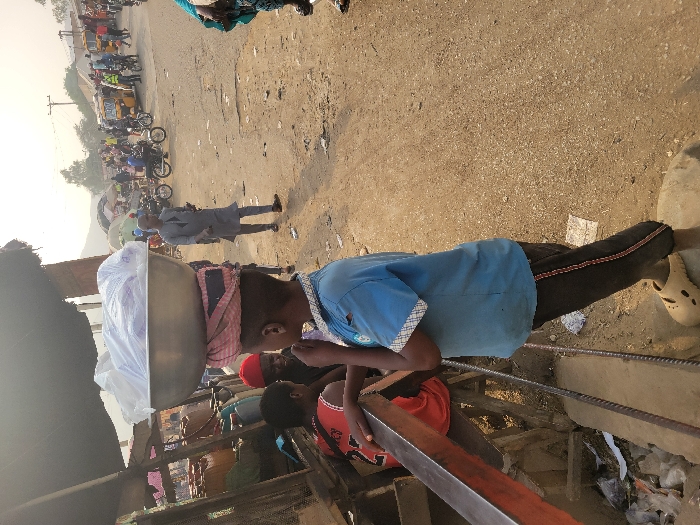 An outdoor scene in Sabojibi, Nigeria, depicts a busy, unpaved market street under hazy daylight. In the foreground, a young boy, facing partially away from the camera, carries a large silver metal bowl on his head, supported by a pink and white checkered cloth wrap. The bowl contains white, plastic-wrapped items. He wears a light blue short-sleeved shirt with patterned trim, dark pants with a reddish stripe, and light-colored slip-on clogs, and his right hand is near his chin. He stands on a small elevated stone next to a dark metal beam that is part of a market stall structure. Beneath this stall, two other individuals are visible: one wearing a red basketball jersey with "22" partially visible, leaning on the beam, and another wearing a red cap, partially obscured. Yellow jerry cans and other containers are present under the stall, with trash and debris on the ground. The midground features a man in a light grey traditional outfit walking towards the left. The background reveals a wide, dusty thoroughfare populated by numerous people, parked and moving motorcycles, and several yellow tricycles (keke napep). Further back, indistinct market stalls or shelters are visible, against a backdrop of distant hills and a light-colored sky with utility poles.