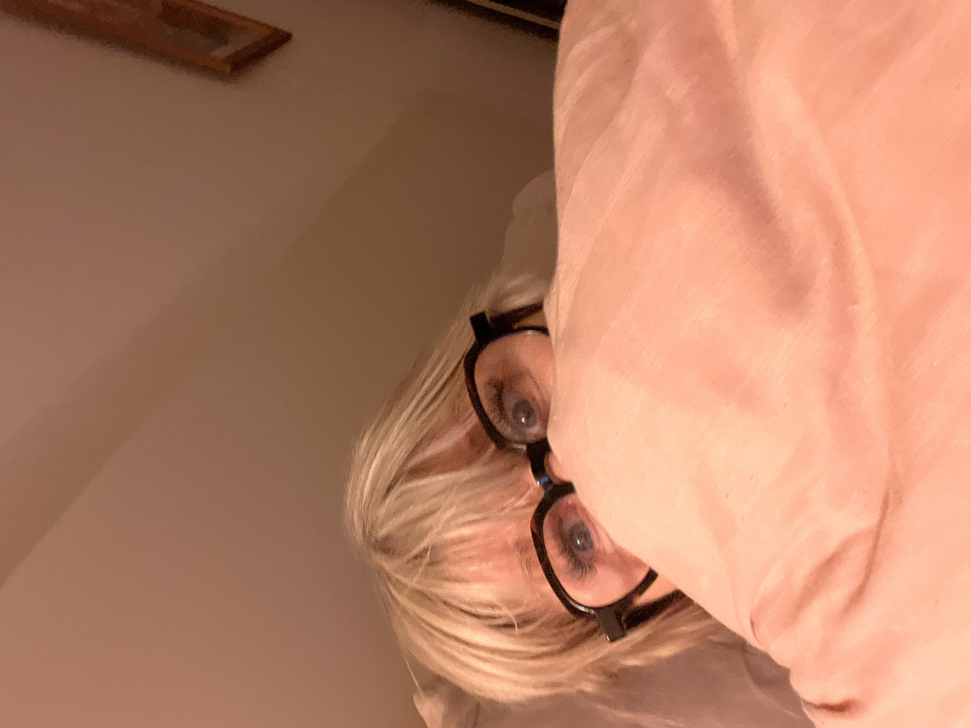 The image depicts a close-up of a single individual, likely female, in an indoor setting in Chambœuf, France. The person has blonde hair, visible bangs, and wears dark-framed eyeglasses. Only the upper portion of the face, from the forehead to just below the eyes, is visible, peeking over a voluminous, peach-colored fabric object, possibly a blanket or duvet. The eyes are open and directed forward. Behind the individual's head, a light-colored pillow is partially visible. The background consists of a plain, light-brown or beige wall, dimly lit with a warm tone. In the upper right quadrant of the frame, a segment of a framed object, possibly a picture or mirror, with a dark border is visible on the wall.