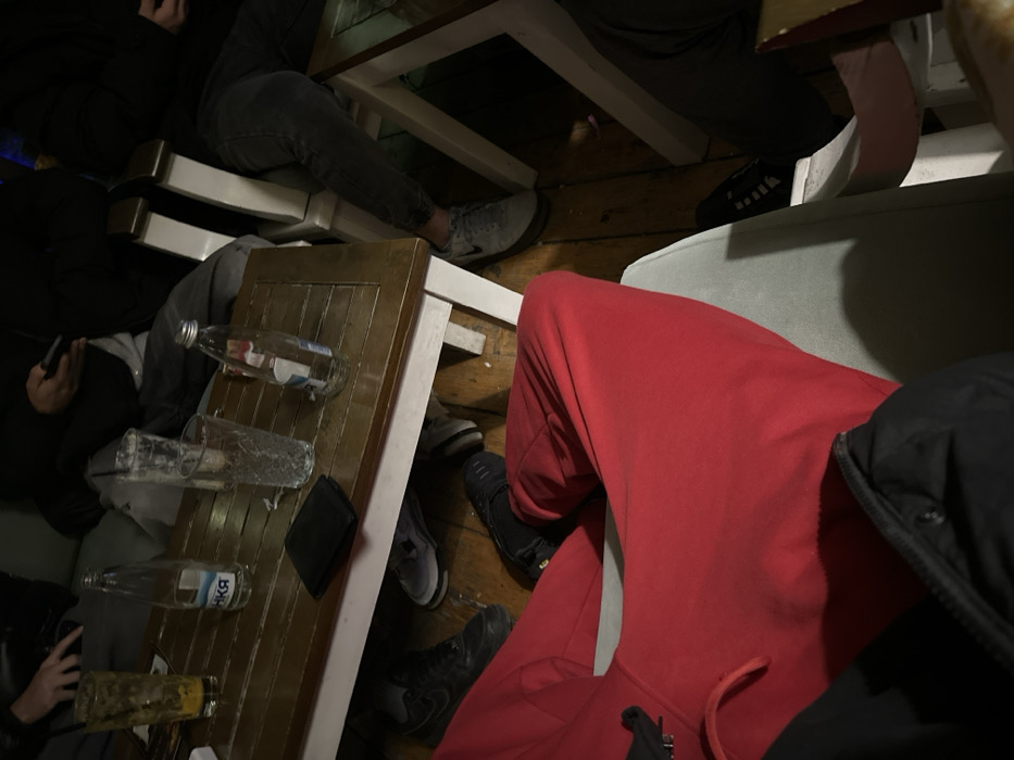 The image depicts an indoor scene within a casual establishment in Karlovo, Bulgaria. A rectangular table with white-painted legs and a distressed wooden top occupies the central view. On the tabletop are: one tall glass containing yellow liquid residue and a drinking straw, one clear glass bottle labeled "БАНКЯ" (Bankya) appearing partially full, one empty tall clear drinking glass, one empty silver-capped clear glass bottle with a red label fragment, and a closed black wallet. The floor is constructed of wooden planks. Several individuals are partially visible. In the immediate foreground, a person wears a red hooded sweatshirt and a dark jacket. Their black Nike sneakers are visible on the floor beneath the table. To the upper left, a person in dark clothing holds a mobile device. To the right, an individual in dark grey jeans has their light grey sneaker visible on the floor under the table. Additional footwear visible beneath the table indicates at least four individuals are present. The environment appears dimly lit.