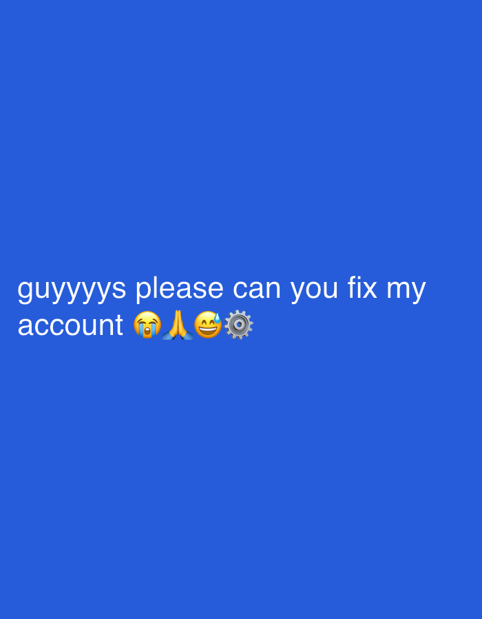 A blue background displays the text "guyyyyys please can you fix my account" followed by a string of emojis: 😂 (Face with Tears of Joy), 🙏 (Folded Hands), 😅 (Grinning Face with Sweat), and ⚙️ (Gear)