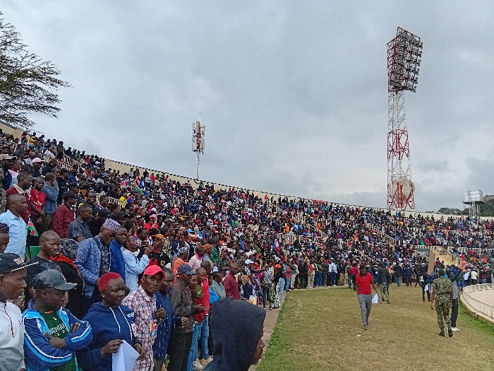 The image depicts a large outdoor stadium, likely the Moi International Sports Centre (MISC) in Kasarani, Nairobi, Kenya, under an overcast sky