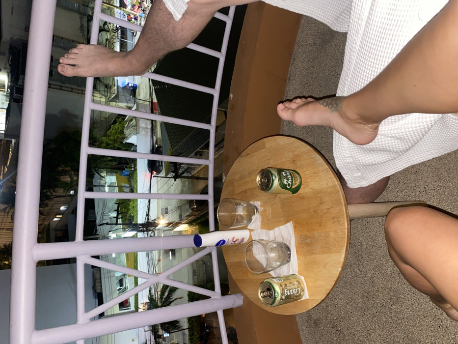The image displays a nighttime scene from an elevated balcony in Pattaya City, Thailand. Two individuals are partially visible, seated or lounging. On the right, a bare right leg with a visible tattoo on the ankle is propped on a white metal balcony railing. This individual wears a white, textured garment, likely a bathrobe. The bare lower legs of a second individual are visible at the bottom-left of the frame. A small, round, light-colored wooden table is centrally positioned. On the table are two clear glass tumblers, two white paper napkins, one open gold-colored Chang Beer can, one green-colored Chang Beer can (unopened or recently opened), and a white bottle with a blue cap, consistent with Nivea brand lotion. The balcony features a white metal railing with cross-bracing and an orange-brown lower wall. The floor surface is dark and textured. Below, a city street is visible, illuminated by artificial light. Vehicular traffic, including a dark SUV-like vehicle, is present. Buildings line the street, some with illuminated interiors, including what appears to be a car showroom displaying white vehicles. Overhead power lines crisscross the view, and palm trees are visible in the tropical urban environment.