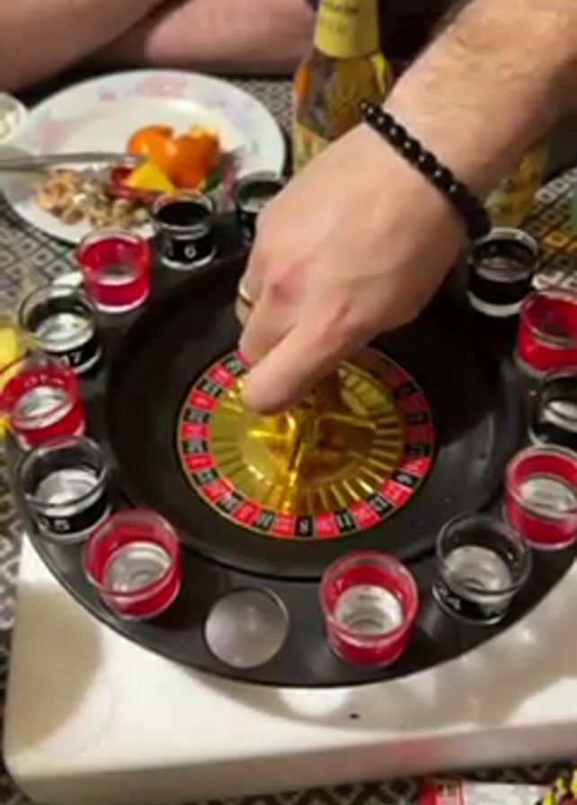 Two individuals are positioned at a table, where one person sets a roulette wheel in motion. The roulette wheel, situated at the center of the table, has shot glasses containing liquid arranged around its perimeter. The shot glasses alternate in color between red and black. Adjacent to the roulette wheel are two bottles of Perlenbacher Gold beer. A plate with fruit slices, including oranges and other unidentified fruits, is also visible on the table. Other items, such as small vials or containers with yellow labels, are scattered around the scene. The table covering appears to be patterned with a dark geometric design.