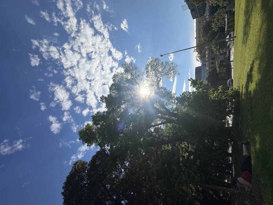 The image presents an outdoor scene within Carlton Gardens, Carlton, Australia, on a bright, sunny day. The upper half of the frame displays a clear blue sky with scattered cumulus clouds, concentrated towards the right. The sun is visible in the upper-mid right, partially obscured by tree branches, emitting a strong lens flare and backlighting the foliage. Large, mature trees with dense, dark green leaves dominate the left and central portions of the image, their forms silhouetted against the bright sky. In the lower-left quadrant, one individual is observed lying prone on the green grass, facing right, with their head resting on their left arm. They are wearing a red top and dark trousers. Shadows from the trees are cast across the foreground grass. A dark lamppost or utility pole stands upright in the mid-right. Beyond the grassy expanse, a paved road or parking area is visible, with a white vehicle and other indistinct vehicles present. Multi-story urban buildings, including one with a textured or patterned facade on the far right, form the background.