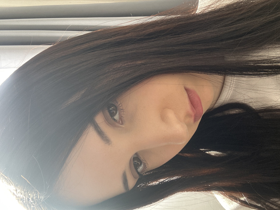The scene is located in Nanterre, France. The image presents a close-up, portrait-oriented view of a single individual, identified as female, in an indoor setting. The individual's head is tilted approximately 10-15 degrees downward and to the right. Long, straight, dark brown hair, parted on the viewer's left, frames the face and extends over the shoulders, partially obscuring the right side of the face. The subject exhibits fair skin, dark brown eyes with visible eyelashes, and defined dark eyebrows. The nose is prominent. The lips are medium-full, displaying a neutral pink color, and are slightly parted. A light-colored, possibly white or off-white, crew-neck garment is visible at the bottom of the frame. The background is out of focus; light-colored vertical curtains or blinds are discernible on the right side. An intense light source, originating from the upper left, creates a lens flare in that quadrant and illuminates portions of the subject's hair. The individual's gaze is directed towards the camera.