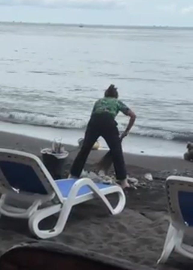 A person wearing a green patterned shirt and black pants is sweeping debris on a black sand beach with a broom. The person is standing with their back to the camera, bending at the waist to sweep. To the left of the person is a black trash can and two white and blue beach chairs. The beach fronts a body of water with small waves. There are a few boats visible in the distance. The sky is overcast. The foreground includes a dark wooden structure, partially obscuring the view.