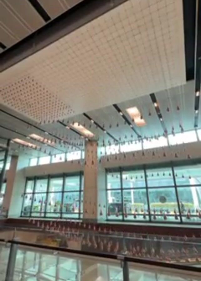 The camera looks up from inside an airport toward a white grid pattern on the ceiling, from which dangle small, red teardrop-shaped objects