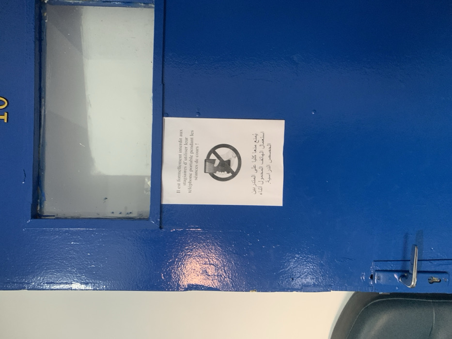 The image displays a blue door with a window and a sign prohibiting the use of cell phones during class. The sign includes a visual symbol of a cell phone with a line through it. Text on the sign is in French and Arabic, both conveying the message that trainees are strictly forbidden from using their mobile phones during class sessions.