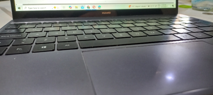 A close-up shot reveals a gray Huawei laptop. The camera focuses on the keyboard and trackpad area. The black keys contrast against the gray body. Reflections catch the trackpad's surface, creating a bright spot. The laptop screen is partially visible in the background, displaying the Windows interface. The overall lighting is bright, contributing to the image's sharpness.