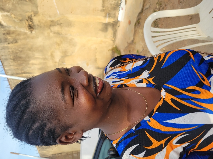 A woman with dark skin and braided hair is seen smiling outdoors. She wears a colorful top with a blue, orange, black, and white pattern, along with a delicate gold chain. A partially visible white plastic chair and a tan wall are in the background. Sunlight casts shadows on her face, creating contrast in the image.