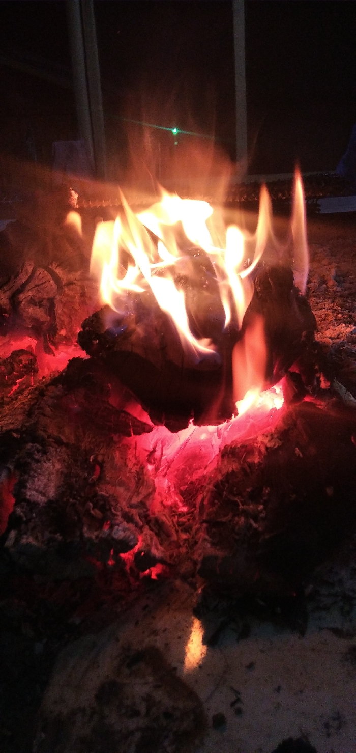 A close-up shot captures a vibrant campfire at night. Intense flames dance above glowing embers, casting a warm, red light on the surrounding wood. Smoke rises amidst the fire. In the background, the dark outline of a structure is vaguely visible, punctuated by a small green light shining through. The foreground shows a textured surface with ash, reflecting the fire's glow.