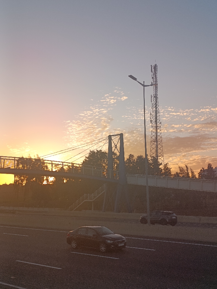 The scene depicts a multi-lane highway in Salé, Morocco, observed at either sunrise or sunset, characterized by warm, low-angle illumination emanating from the left horizon. In the foreground, a dark-colored sedan travels from right to left on the nearest lane, indicated by white dashed markings. Further right on an adjacent lane, a dark-colored SUV is also in motion. A light-colored pedestrian suspension bridge spans the highway in the mid-ground, featuring two prominent blue A-frame support towers, multiple suspension cables, and staircases providing access from ground level. To the right of the bridge, a tall, dark street light pole with a single luminaire is positioned roadside. Immediately adjacent to the street light, a metallic lattice telecommunications tower stands, equipped with multiple antennae and cellular communication dishes. The sky exhibits a gradient, transitioning from a warm orange-yellow on the left horizon to a cooler light blue-grey on the right, interspersed with scattered, small altocumulus clouds. Silhouetted trees are visible beyond the pedestrian bridge, outlining the horizon. No individuals are discernible.