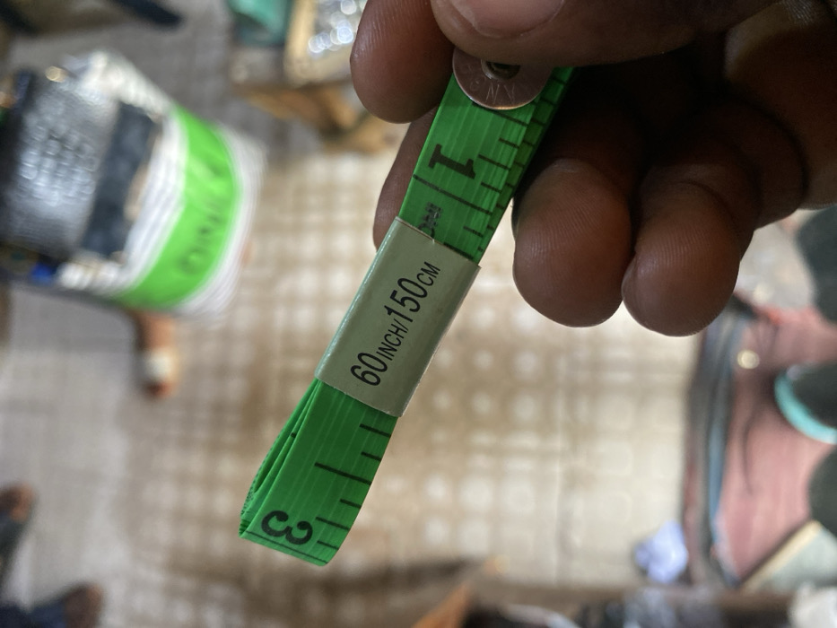 The image, taken in the city of Jos, Nigeria, displays a close-up view of a dark-skinned hand holding a green measuring tape