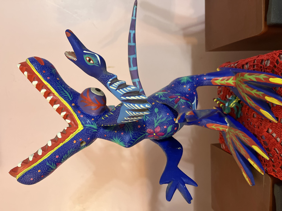 A vibrant, handcrafted alebrije depicting a fantastical creature